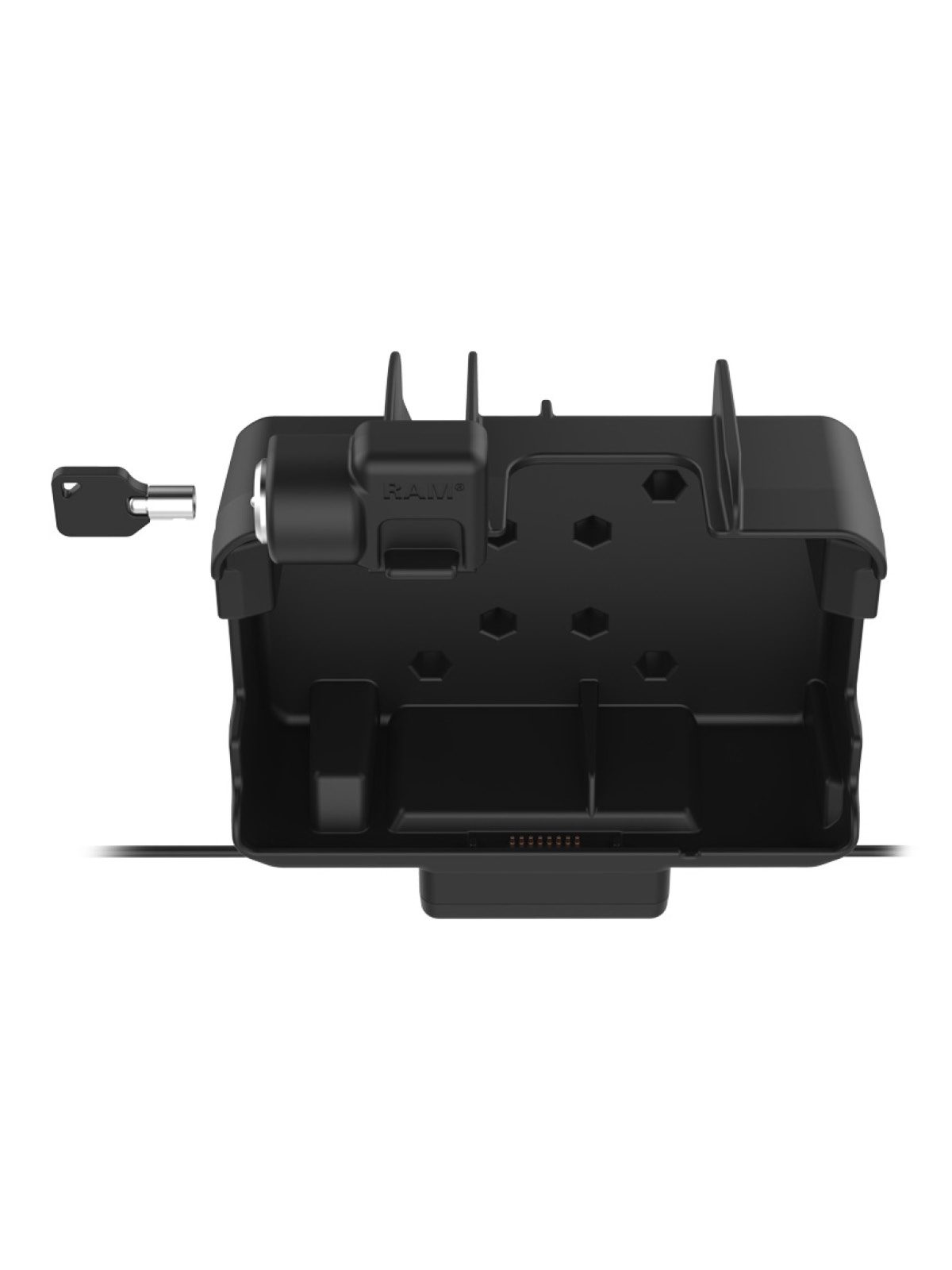 Featuring data and charging capabilities and a key lock for theft deterrence, the RAM Vehicle Dock for the Panasonic FZ-S1 & FZ-L1 allows you to connect a desired peripheral while keeping the device charged through the pogo pin contacts when the device is docked. Power is provided by connecting to the dock's 5.5mm DC power jack, while peripheral support is provided by the built-in USB Type A cable. The dock also allows the tablet's scanning function to work through the opening on the back which also accommodates tablet add-ons such as scanner, hand strap and extended battery. This vehicle dock is compatible with C and D size RAM 4-hole AMPS and 75mm x 75mm VESA pattern bases for attaching a double socket arm in order to complete your mounting solution.