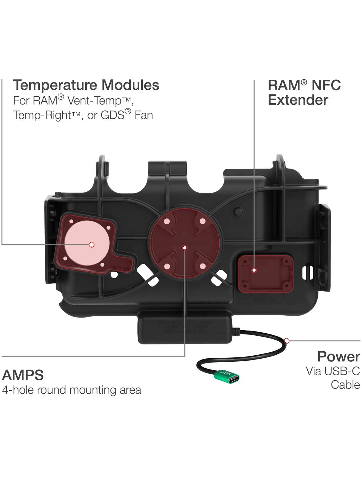 Die Halteschale ist mit dem meisten RAM-Dock-Zubehör, einschließlich Zubehör für RAM Temp Control, RAM NFC-Extender, GDS Roto-Mag und seitlichen Zubehöraufsätzen kompatibel.