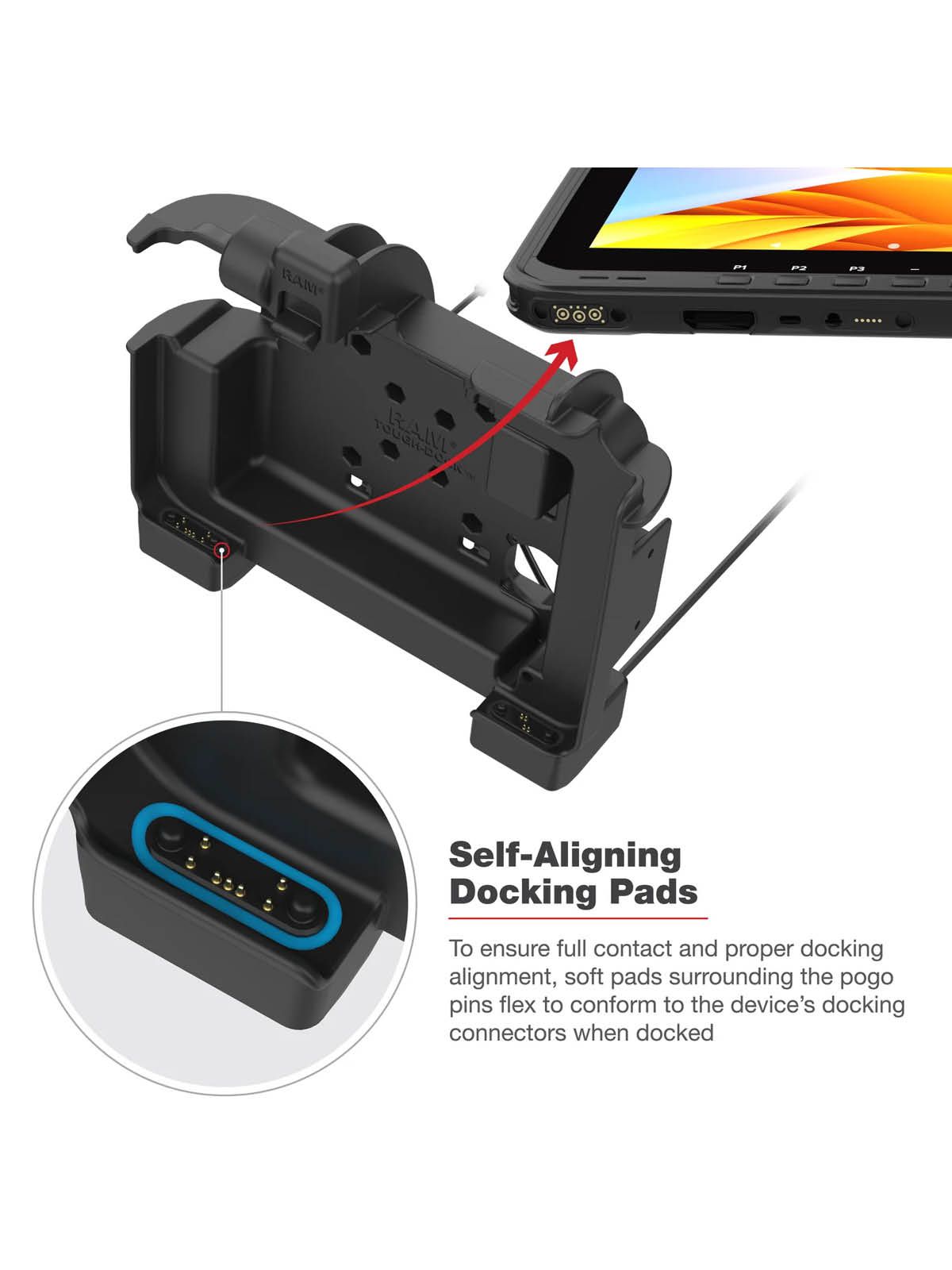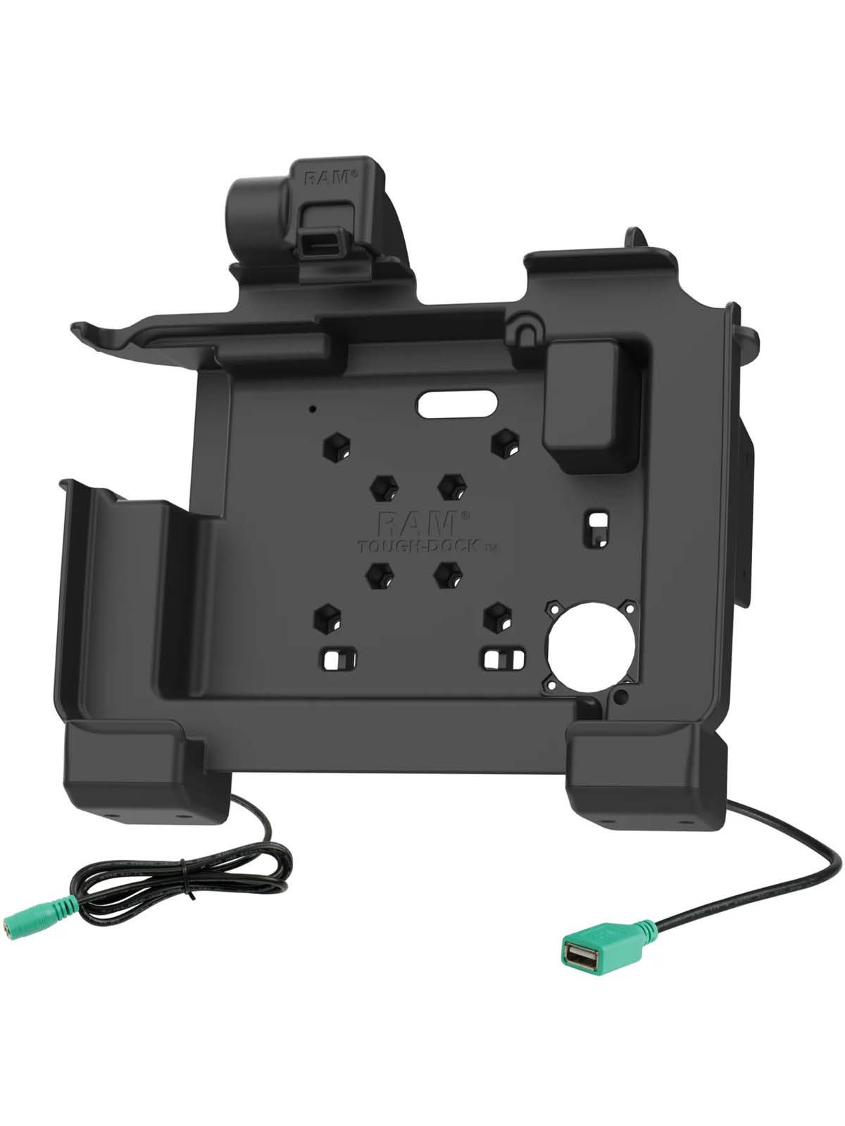 Diese RAM Mounts Form-Fit (Schnappverschluss) Halteschale ist für Zebra ET60 & ET65 Tablets mit oder ohne Zebra Tastatur geeignet. Die Halteschale wird durch einen 5.5mm DC-Anschluss mit Strom versorgt und lädt das Gerät in dem Dock auf. Peripheriegeräte werden über den integrierten USB-A Anschluss unterstützt.