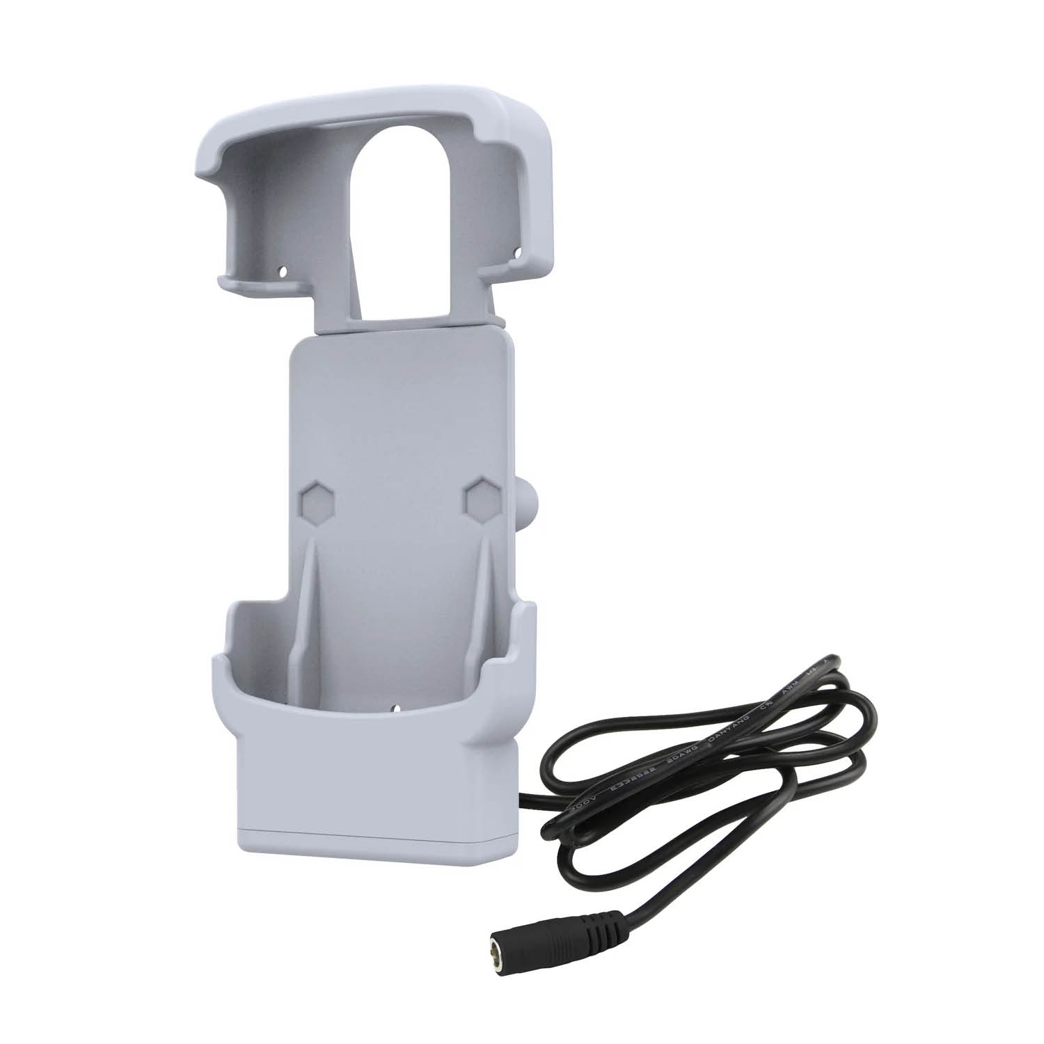 Die Halteschale wird durch einen 5.5mm DC-Anschluss mit Strom versorgt und lädt das Gerät in dem Dock auf.