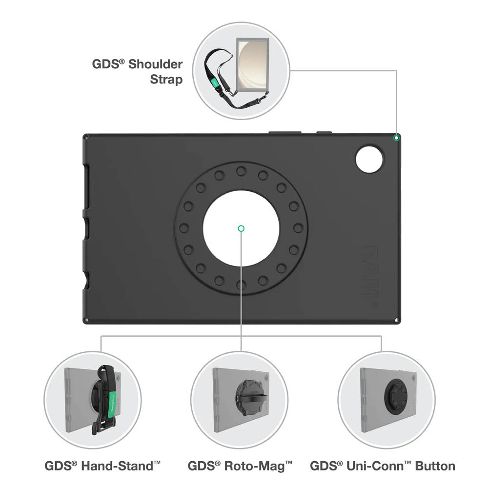 The RAM® Skin for Samsung Tab A9 (RAM-SKIN-SAM97) is a form-fit, MIL-STD-810H drop test protected sleeve designed specifically for the Tab A9. It is a non-powered accessory and features an ergonomic accessory access point integrated into the back for accessories like the GDS® Uni-Conn™ Adapter, GDS® Hand Strap, GDS® Hand-Stand™, and the GDS® Roto-Mag™.