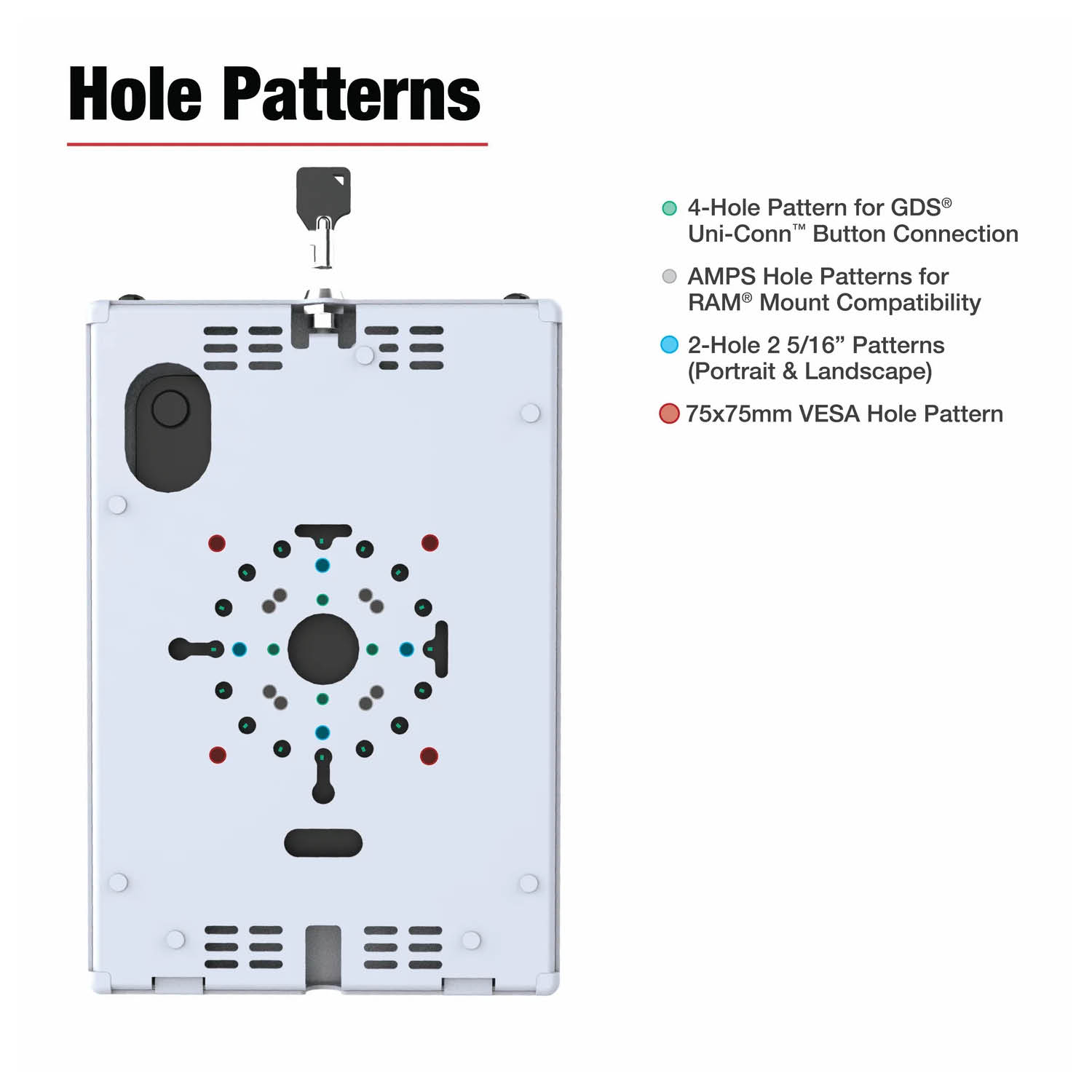 Custom-fit for the Apple iPad mini, the Safe-Case™ features precision cutouts for full access to the device’s lock button, USB-C port, and rear camera. Ventilation slots and speaker openings maintain device functionality without compromising protection. The smooth gray finish not only blends well into professional and industrial settings but also adds a clean, modern aesthetic. The enclosure features versatile mounting options with integrated hole patterns for flush mounting, compatibility with RAM® double ball mounts, or 75x75mm VESA stands.