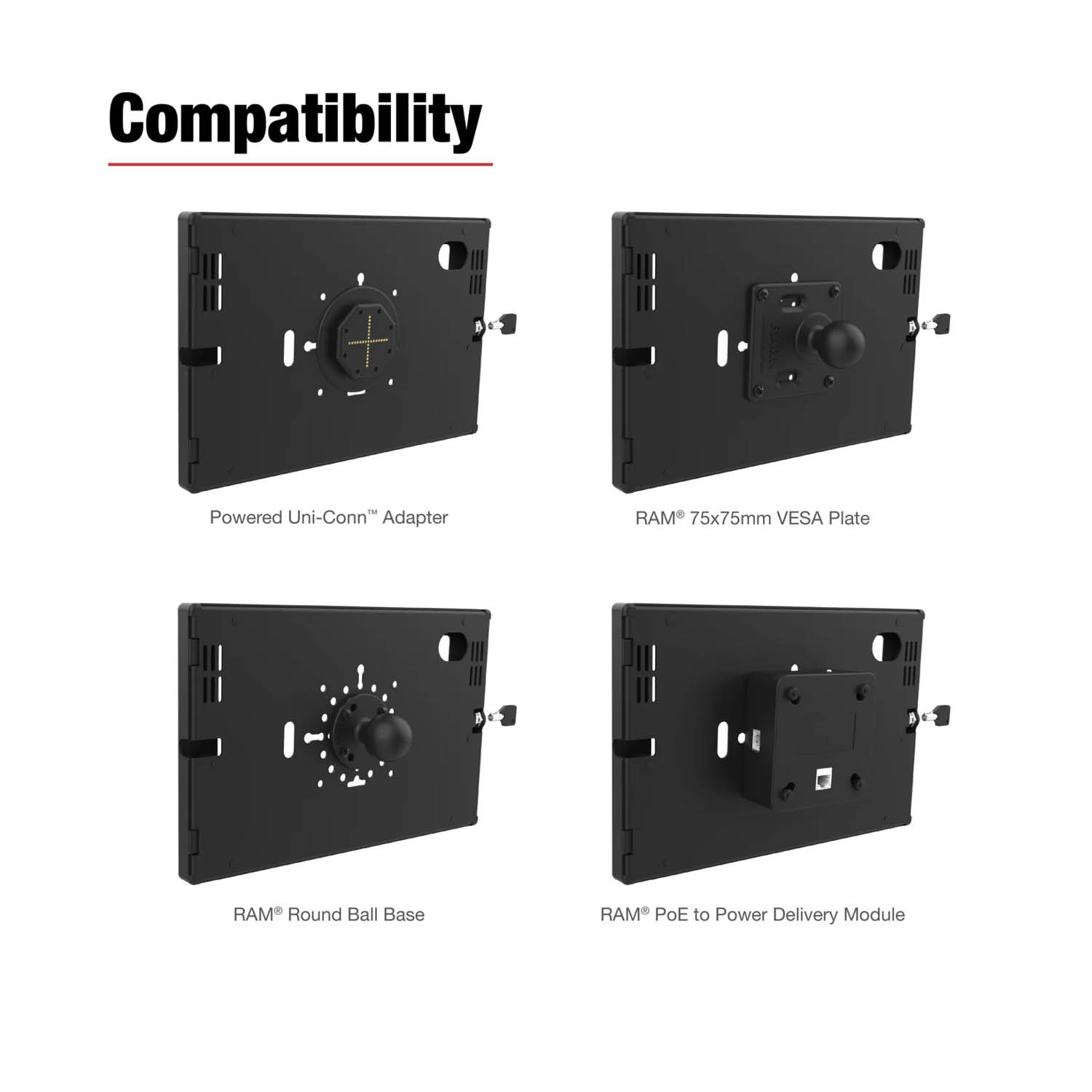 Secure to RAM® ball mounts with VESA and AMPS pattern; or flush mount