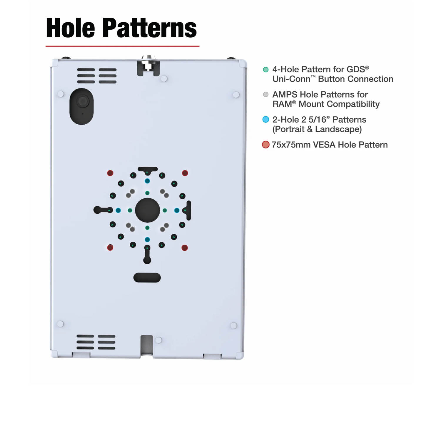 Ventilation slots and speaker openings maintain device functionality without compromising protection. The smooth gray finish not only blends well into professional and industrial settings but also adds a clean, modern aesthetic. The enclosure features versatile mounting options with integrated hole patterns for flush mounting, compatibility with RAM® double ball mounts, or 75x75mm VESA stands.