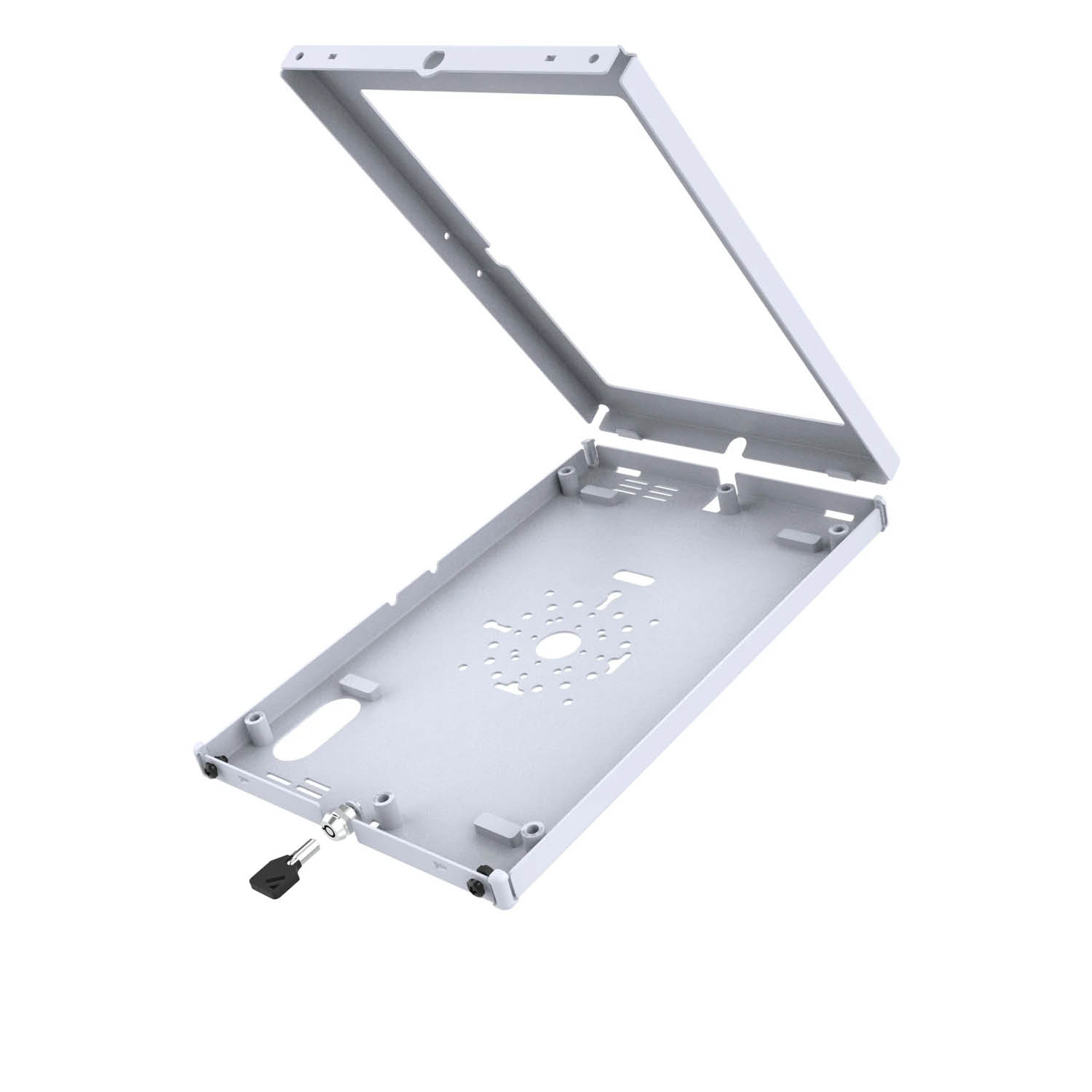 Ventilation slots and speaker openings maintain device functionality without compromising protection. The smooth gray finish not only blends well into professional and industrial settings but also adds a clean, modern aesthetic. The enclosure features versatile mounting options with integrated hole patterns for flush mounting, compatibility with RAM® double ball mounts, or 75x75mm VESA stands.