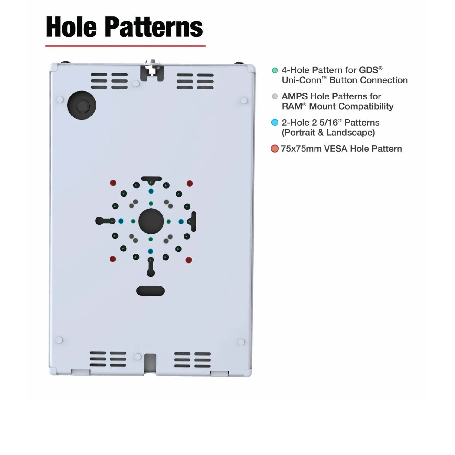 Ventilation slots and speaker openings maintain device functionality without compromising protection. The smooth gray finish not only blends well into professional and industrial settings but also adds a clean, modern aesthetic. The enclosure features versatile mounting options with integrated hole patterns for flush mounting, compatibility with RAM® double ball mounts, or 75x75mm VESA stands.