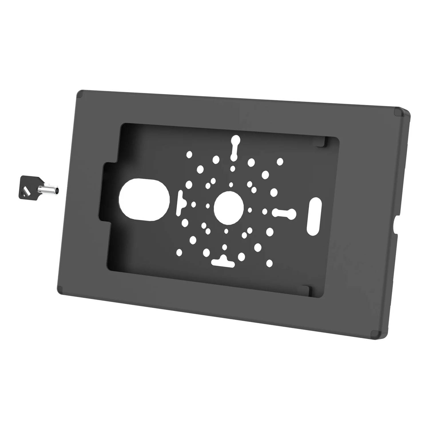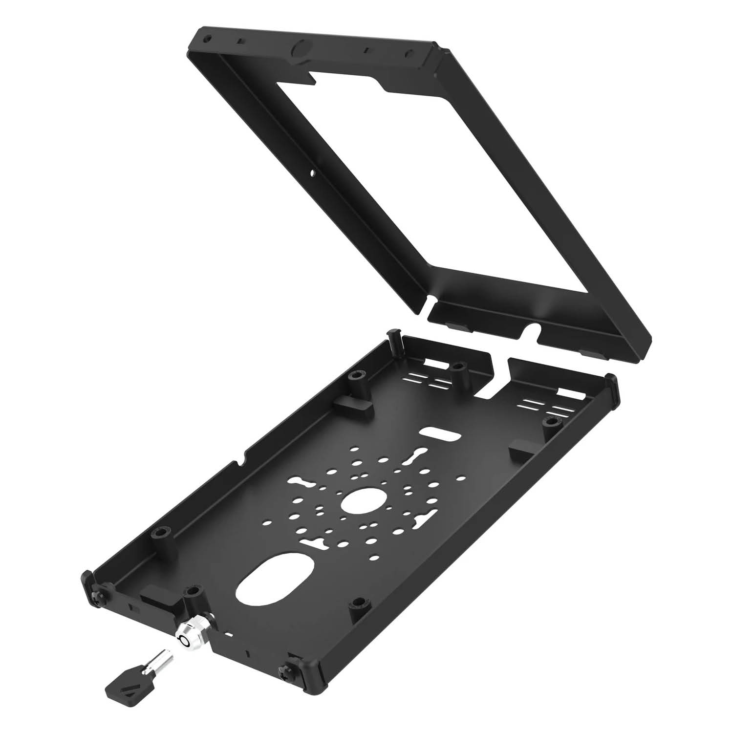 Ventilation slots and speaker openings maintain device functionality without compromising protection. The enclosure features versatile mounting options with integrated hole patterns for flush mounting, compatibility with RAM® double ball mounts, or 75x75mm VESA stands.
