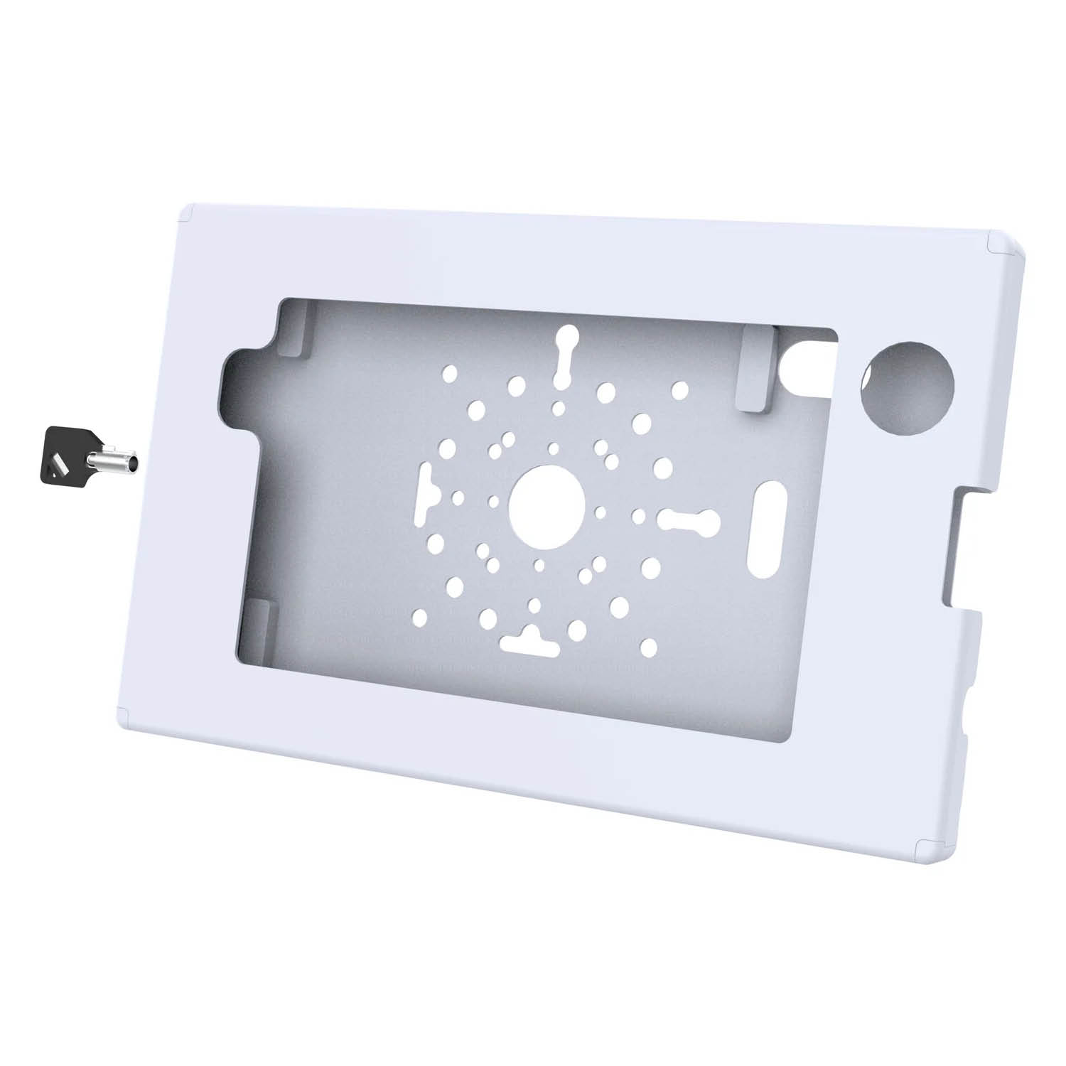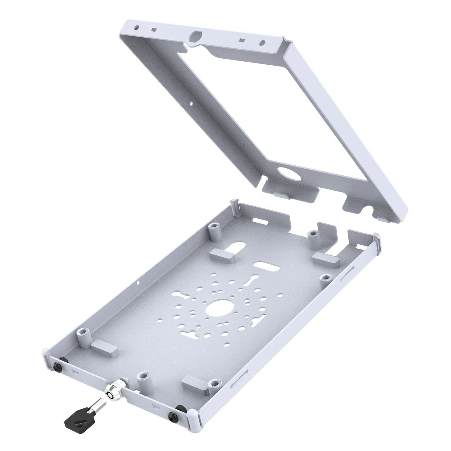 The smooth gray finish not only blends well into professional and industrial settings but also adds a clean, modern aesthetic. The enclosure features versatile mounting options with integrated hole patterns for flush mounting, compatibility with RAM® double ball mounts, or 75x75mm VESA stands.