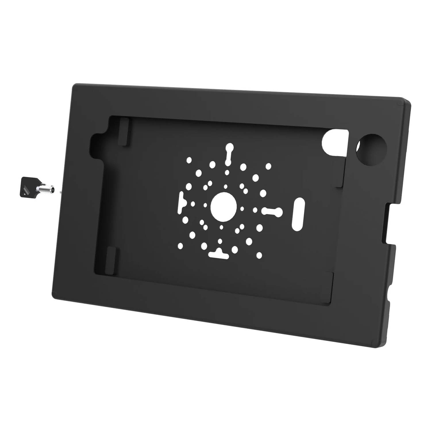 Ventilation slots and speaker openings maintain device functionality without compromising protection. The enclosure features versatile mounting options with integrated hole patterns for flush mounting, compatibility with RAM® double ball mounts, or 75x75mm VESA stands.
