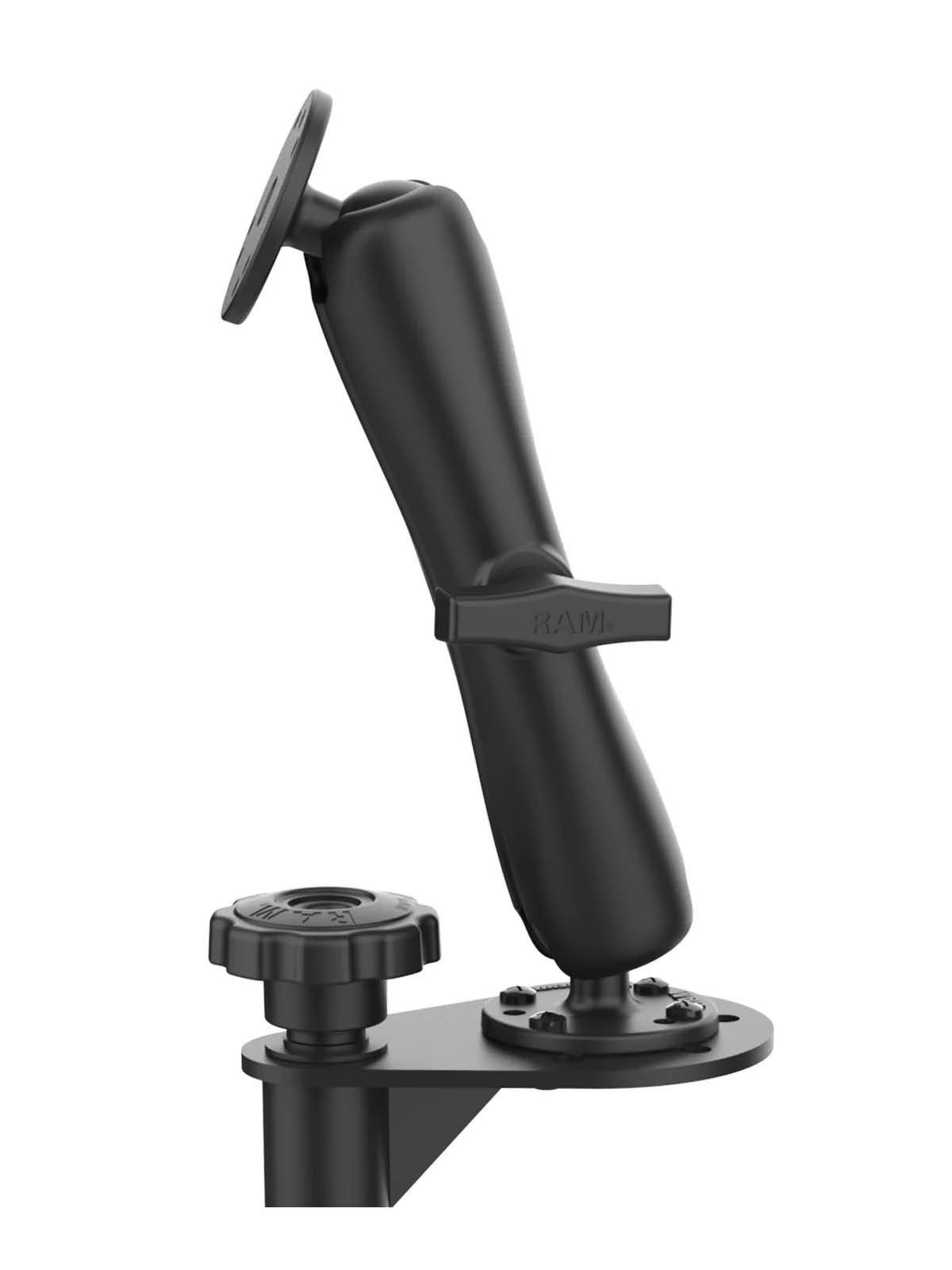 The RAM® No-Drill™ Ball Mount for '12-24 RAM 2500-5500 + More (RAM-VB-178A-DB2) installs quickly and easily into the specified vehicles using the existing hardware of the passenger side seat rails. This configuration provides a telescoping feature with upper and lower poles that allow you to set your mount to the desired height with the simple turn of a knob. The 3-part ball and socket system attached to the pole is compatible with a variety of device holders, while RAM® rubber ball and socket technology provides additional adjustability as well as shock and vibration isolation.