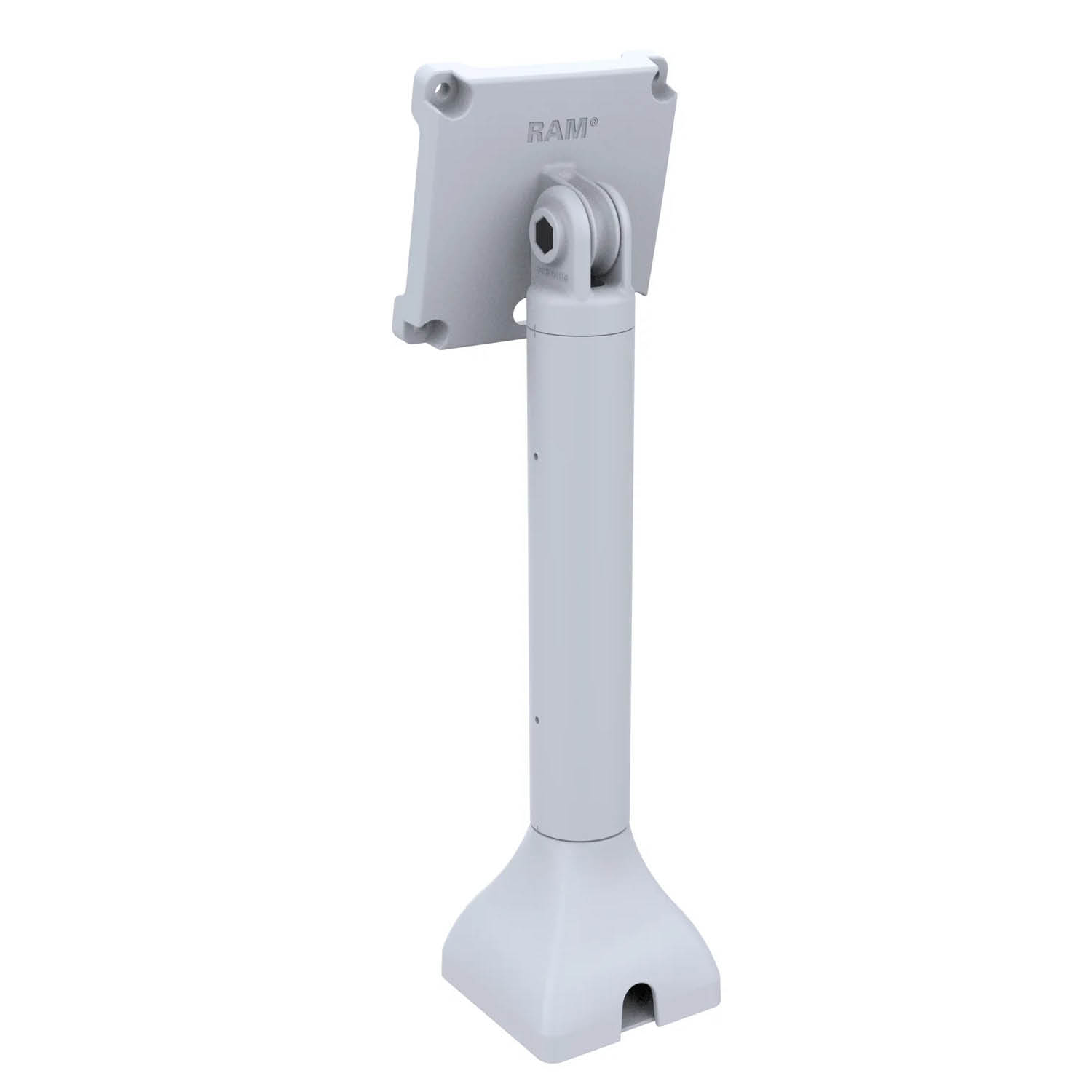Ideal for retail, hospitality, food service, and other point-of-sale or customer-interaction environments, this mount supports VESA 75mm and 100mm patterns for broad device compatibility alongside RAM® docks and holders. This mount features cut-outs for cable management and routing from devices, down through the pedestal, and out of the bottom for a clean workspace. The drill-down base ensures a secure, fixed installation - making it perfect for high-traffic or semi-permanent setups. Made in a light gray color, the mount blends seamlessly into clean, modern, and aesthetic environments where subtlety and professional appearance matter.